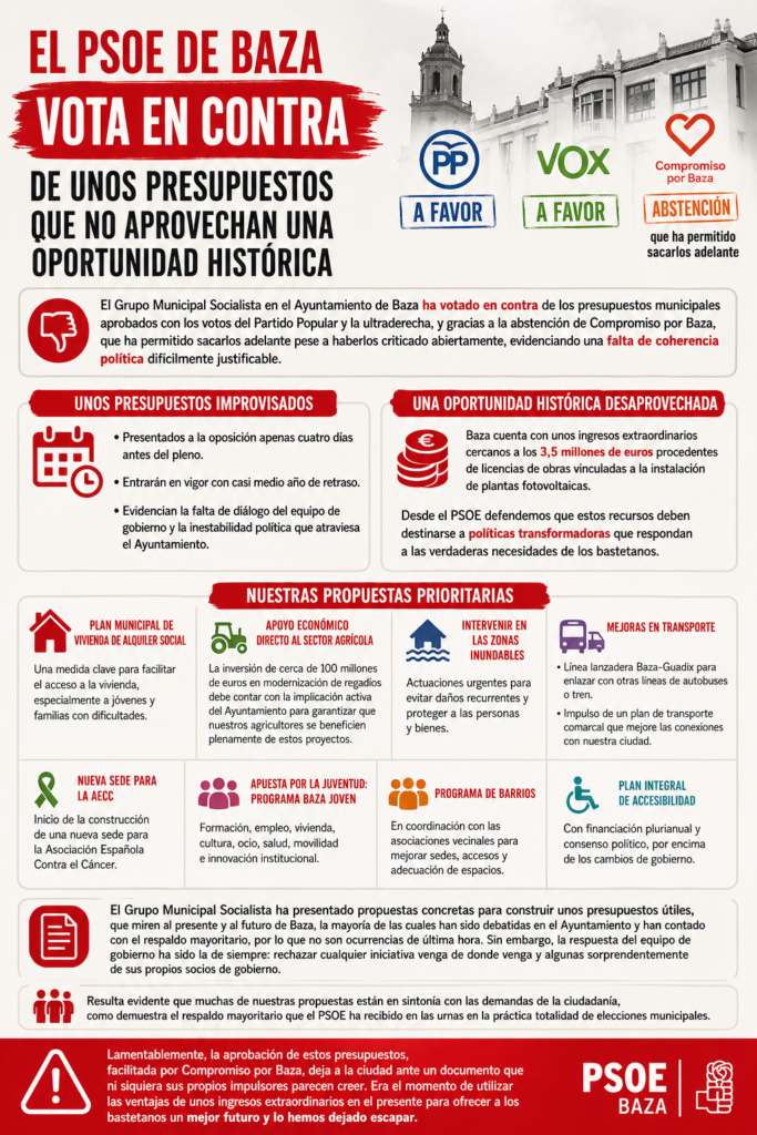 El Grupo Municipal Socialista en el Ayuntamiento de Baza ha votado en contra de las presupuestos municipales aprobados con los votos del Partido Popular y la ultraderecha, y gracias a la abstención de Compromiso por Baza,que ha permitido sacarlos adelante pese a haberlos criticado abiertamente, evidenciando una falta de coherencia política difícilmente justificable.